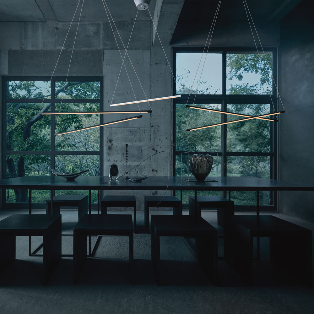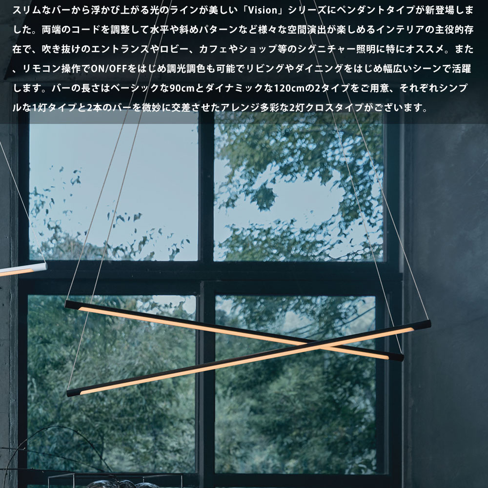 - スリムなバーから浮かび上がる光のラインが美しい「Vision」シリーズにペンダントタイプが新登場しました。両端のコードを調整して水平や斜めパターンなど様々な空間演出が楽しめるインテリアの主役的存在で、吹き抜けのエントランスやロビー、カフェやショップ等のシグニチャー照明に特にオススメ。また、リモコン操作でON/OFFをはじめ調光調色も可能でリビングやダイニングをはじめ幅広いシーンで活躍します。バーの長さはベーシックな90cmとダイナミックな120cmの2タイプをご用意、それぞれシンプルな1灯タイプと2本のバーを微妙に交差させたアレンジ多彩な2灯クロスタイプがございます。