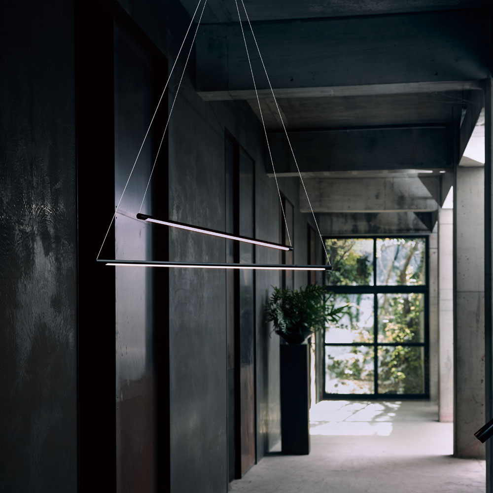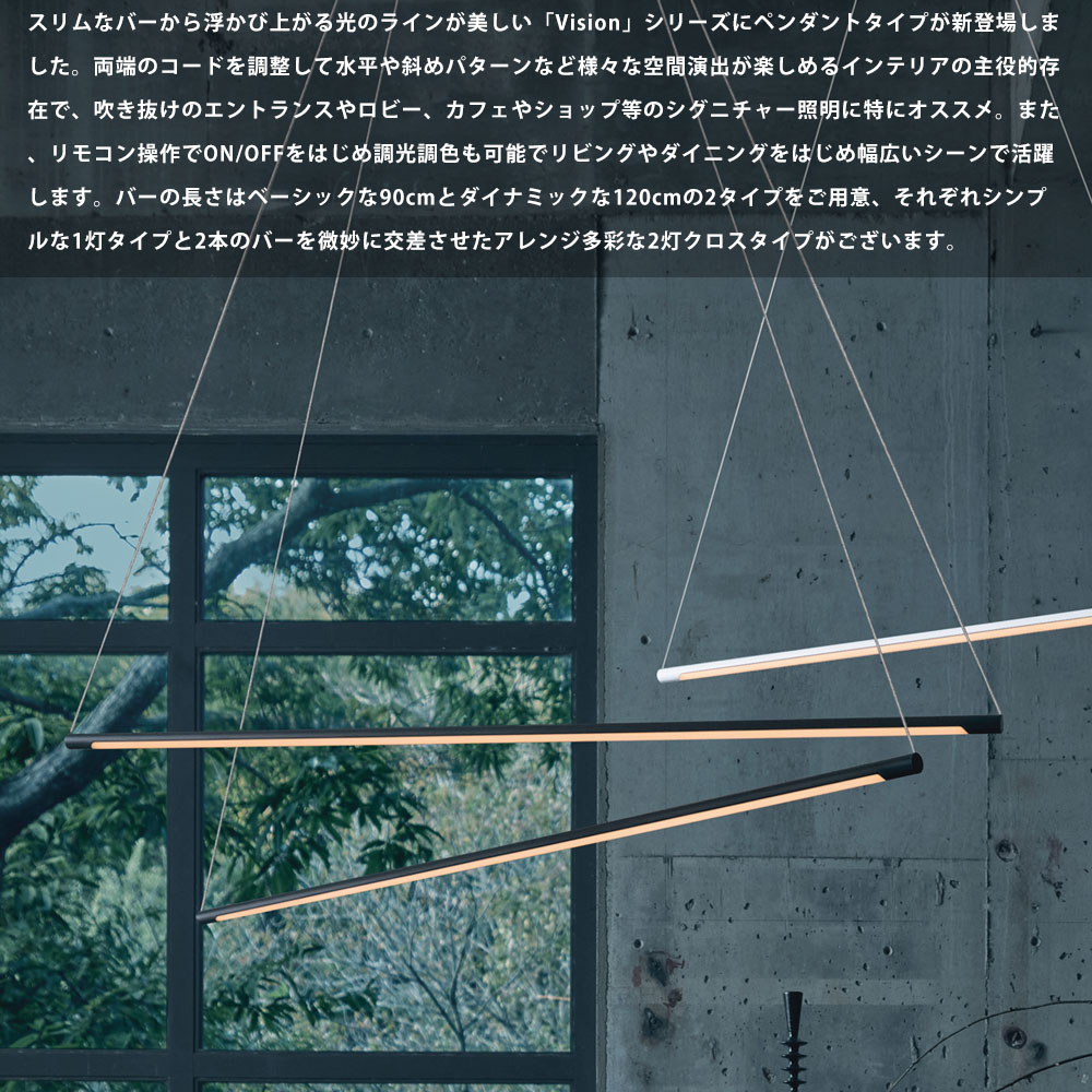- スリムなバーから浮かび上がる光のラインが美しい「Vision」シリーズにペンダントタイプが新登場しました。両端のコードを調整して水平や斜めパターンなど様々な空間演出が楽しめるインテリアの主役的存在で、吹き抜けのエントランスやロビー、カフェやショップ等のシグニチャー照明に特にオススメ。また、リモコン操作でON/OFFをはじめ調光調色も可能でリビングやダイニングをはじめ幅広いシーンで活躍します。バーの長さはベーシックな90cmとダイナミックな120cmの2タイプをご用意、それぞれシンプルな1灯タイプと2本のバーを微妙に交差させたアレンジ多彩な2灯クロスタイプがございます。