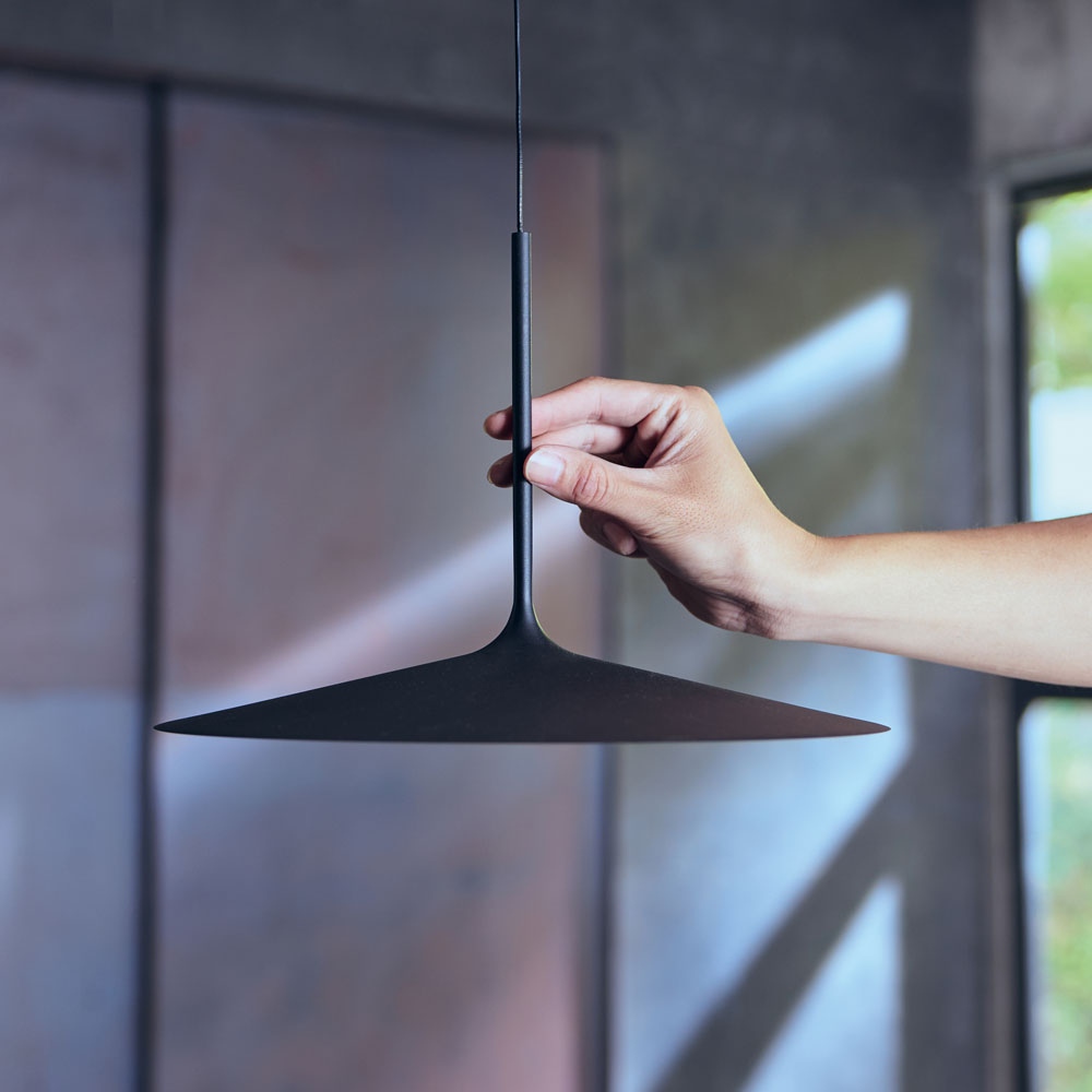 - 洗練されたシャープなフォルムの「Shadow LED-lift pendant light」。扱い易いミニマルな存在感で天井カバーにはリールタイプのコード収納機能を搭載、お好みの位置で手を離すだけで自在に高さ調整が可能です。使い勝手とデザイン性の2拍子が揃った機能美のペンダント照明です。