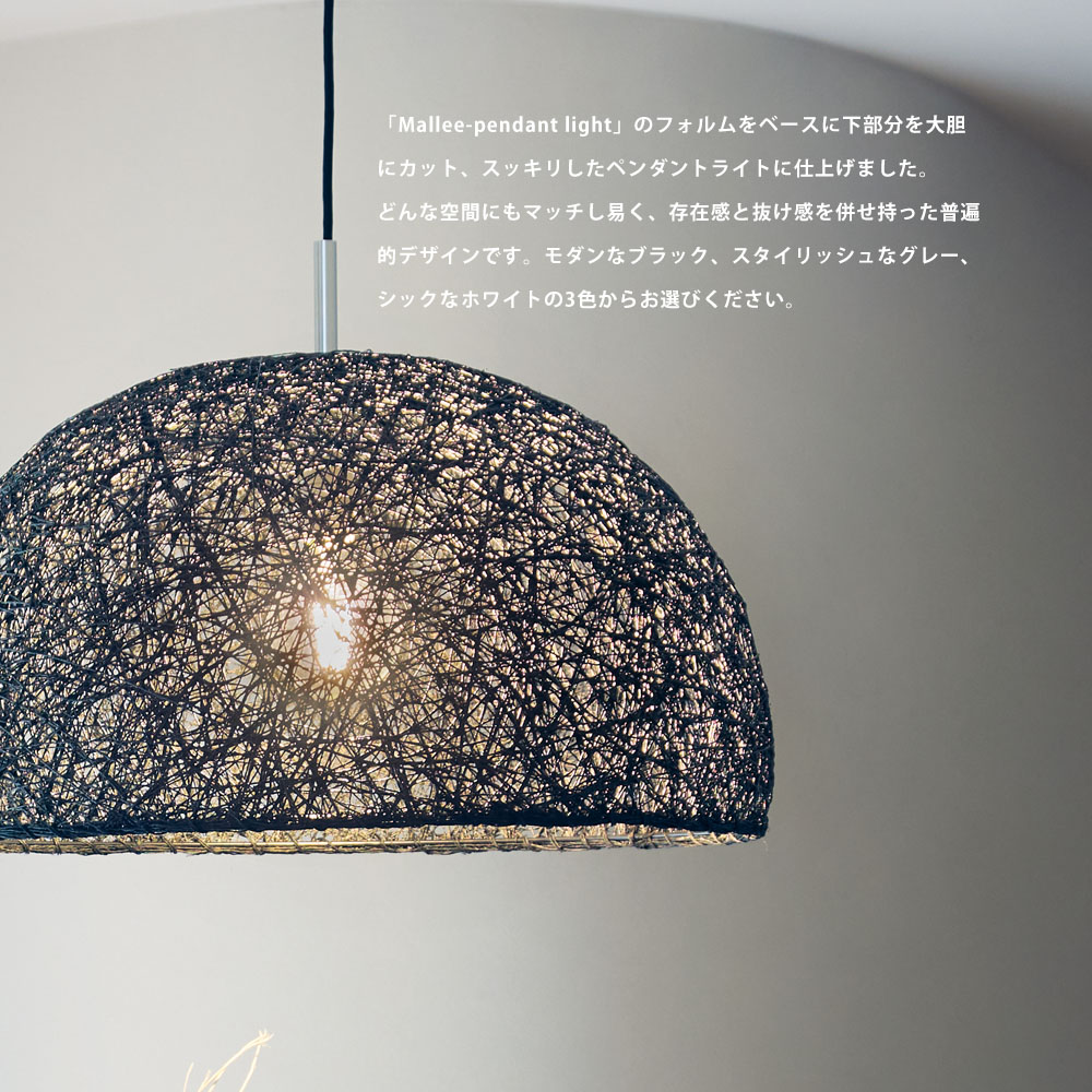 - 「Mallee-pendant light」のフォルムをベースに下部分を大胆にカット、スッキリしたペンダントライトに仕上げました。どんな空間にもマッチし易く、存在感と抜け感を併せ持った普遍的デザインです。モダンなブラック、スタイリッシュなグレー、シックなホワイトの3色からお選びください。