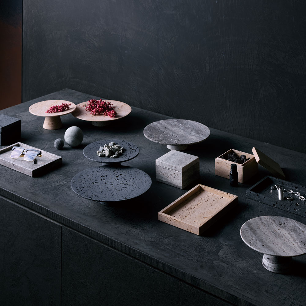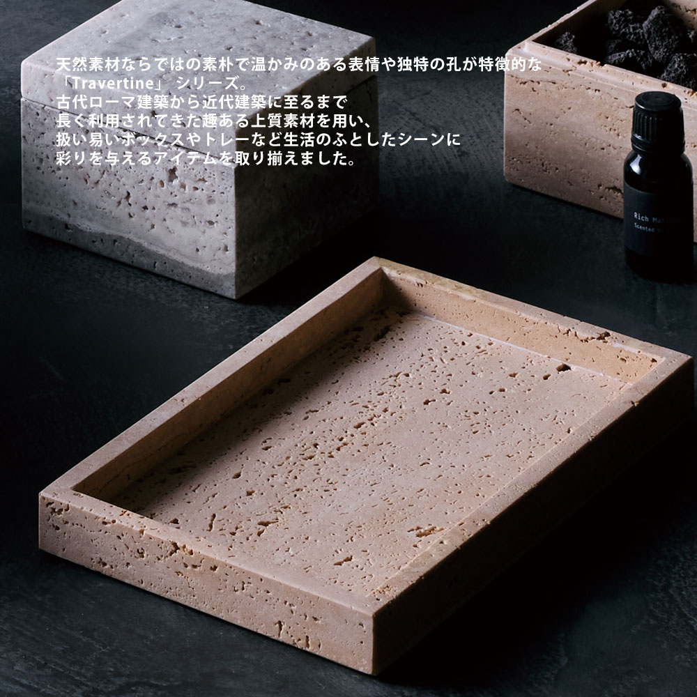 - 天然素材ならではの素朴で温かみのある表情や独特の孔が特徴的な 「Travertine」 シリーズ。古代ローマ建築から近代建築に至るまで長く利用されてきた趣ある上質素材を用い、扱い易いボックスやトレーなど生活のふとしたシーンに彩りを与えるアイテムを取り揃えました。