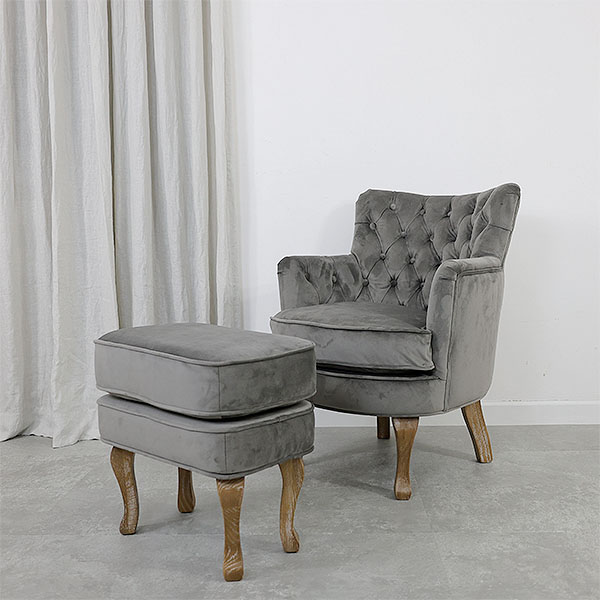 【オンラインショップ限定】【WINTER SALE】NEWカラー ラウンジチェア+オットマンセット 1人掛けソファ ベルベットグレーx猫脚ライト色 パーソナルチェア【玄関前渡-KS22】